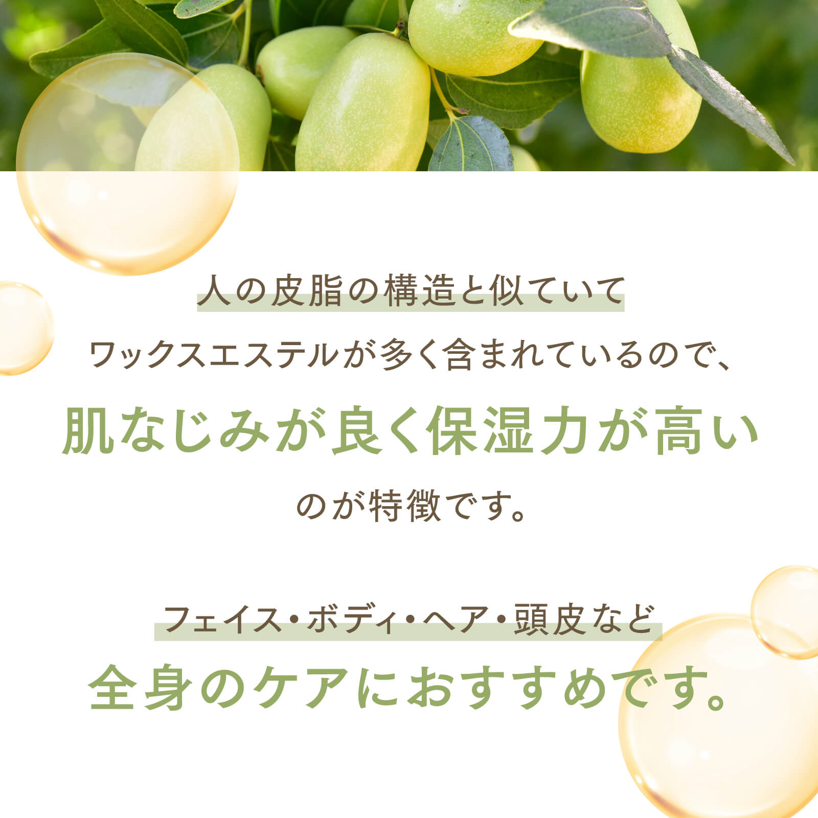 ホホバオイルの主成分である“ワックスエステル”は、肌に塗布することで皮膚のバリア機能である皮脂膜を形成し、肌の水分保持機能をサポートして皮脂バランスを調整してくれます。