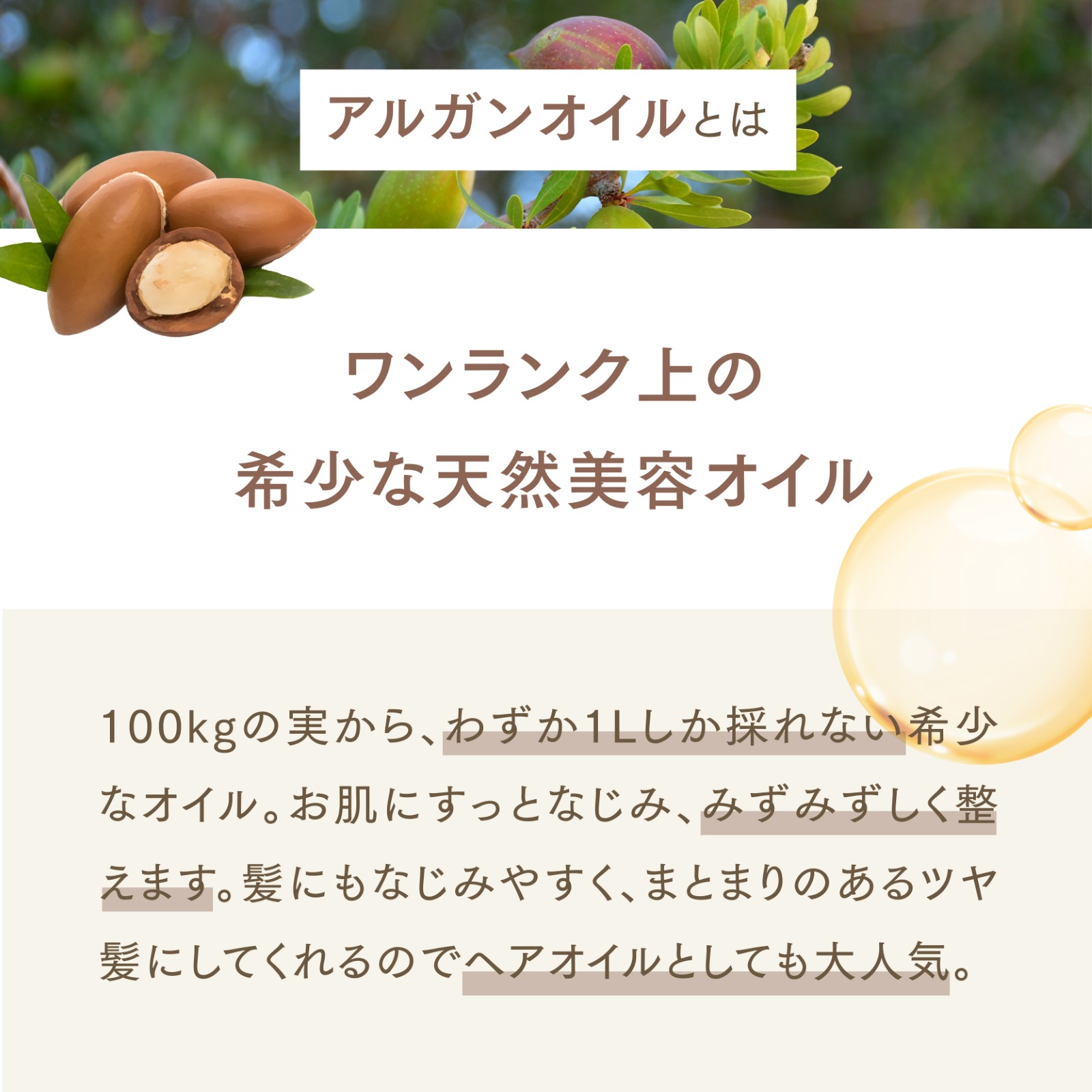 アルガンオイルは髪への浸透性も高く、髪のうるおいを保ち、油分を補い、艶やかでまとまりのある髪に仕上がります。また、ビタミンEやリノール酸が多く含まれているため、乾燥や紫外線によってダメージを受けて固くなった頭皮をやわらげます。