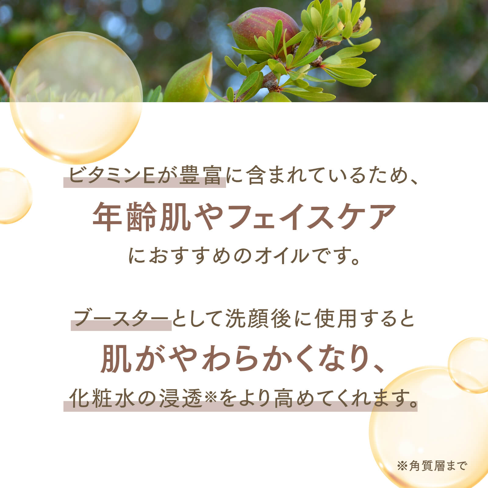 アルガンオイルを構成する成分は、人の皮脂に似ているため肌なじみが良くて角質層へすぐに浸透してくれます。 洗顔後にブースターとして使用することで、お肌の柔軟性を保ち、次に使う化粧水の角質層への浸透を高めてくれることが期待でき、みずみずしいふっくらとした肌へと導きます。