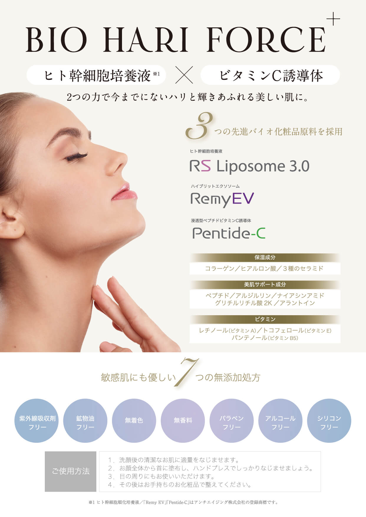 <商品説明> バイオ研究の技術を集結した究極のエイジングケアコスメ ヒト幹細胞培養液とエクソソームの力で、ハリと輝きあふれる美しいお肌へと導きます。 使用方法 ①洗顔後の清潔なお肌に適量をなじませます。 ②全体にまんべんなく塗布し、ハンドプレスでしっかりなじませましょう。 ③目の周りにもお使いいただけます。 ④その後はお手持ちのお化粧品で整えてください。 ※毎日、朝晩の洗顔後・入浴後に使っていただいた場合、お一人でおおよそ1か月で1本の使用目安となります。(個人差がございます。)