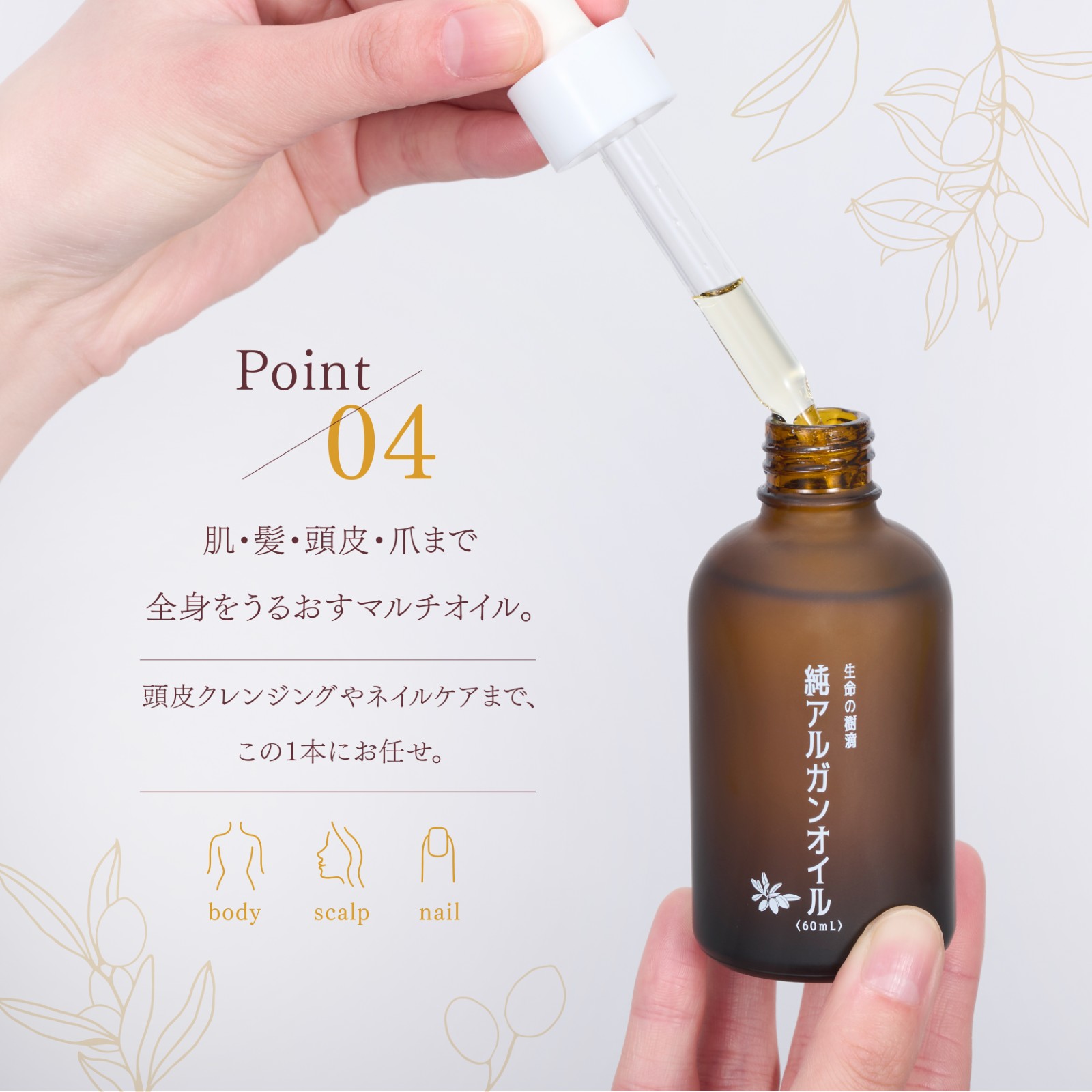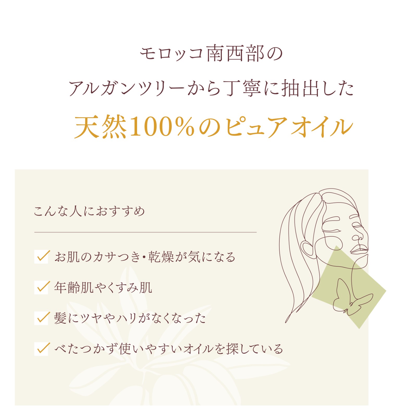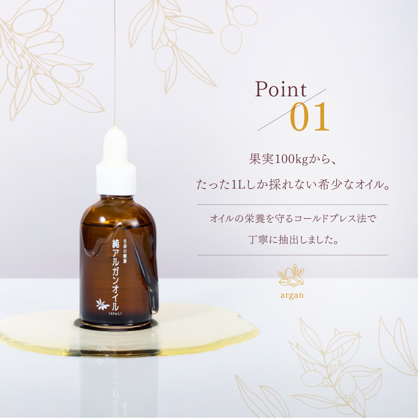 - アルガンオイルは融点の関係で、低温下において結晶化・固形化する場合がありますが、品質には問題ございません。常温下でゆっくりと融解(固形や結晶を液体化)させてご使用ください。