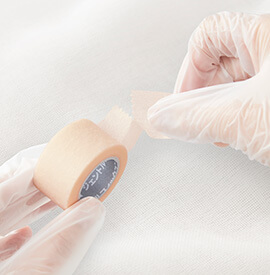 ・臨床上必要な場合以外はテープや皮膚をひっぱらずに貼り、しっかりと圧着してください。