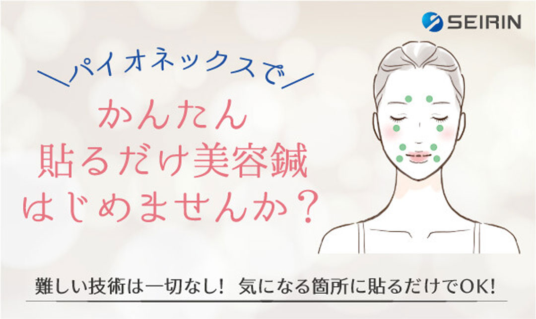 美容鍼にもおすすめです! こんな方におすすめ! 「美容鍼をメニューに導入したいけど内出血のリスクが不安・・・」 →パイオネックスなら毫鍼を使用するより内出血のリスクをぐっと抑えることができます。 「顔に鍼を刺されるのが怖いという患者様が多い・・・」 →顔に鍼を刺されるのは怖いという患者様へ対し、恐怖心を取り除くためにお試しいただくのもおすすめです。 「美容鍼はベッドの回転率が悪く、ニーズがあってもメニューに取り入れにくい・・・」 →パイオネックスなら貼ったまま体位変換も可能なため、ベッドの稼働率に影響を与えずスムーズな施術が可能です。 「気軽に受けられる価格の美容鍼メニューを実施したい」 →手間のかからないパイオネックス美容鍼を比較的安価な金額に設定することで、普段の治療にプラスαのオプションメニューとして気軽に受けていただくことができます。