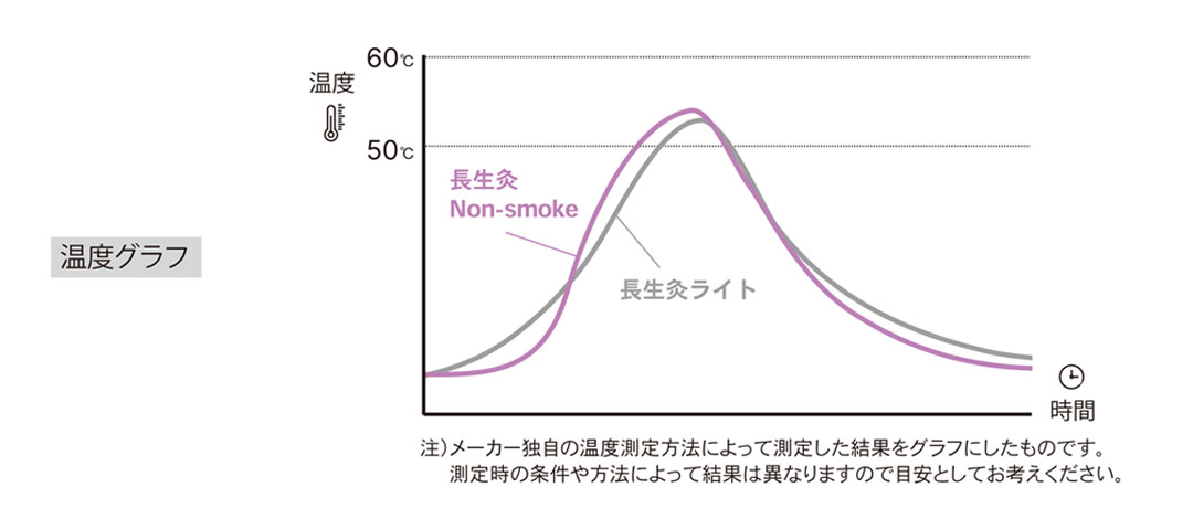 線香でも着火可能! 炭化もぐさの成形に使用する添加物を必要最低限に厳選し、もぐさ本来の火のつきやすさと燃焼スピードを実現しました。 山正独自の製造技術です。(※特許申請済) 点灸のような温熱刺激 燃焼時の温度は従来の長生灸シリーズと同様のグラフを描きます。 そのため点灸のようなピンポイントでの温熱刺激です。