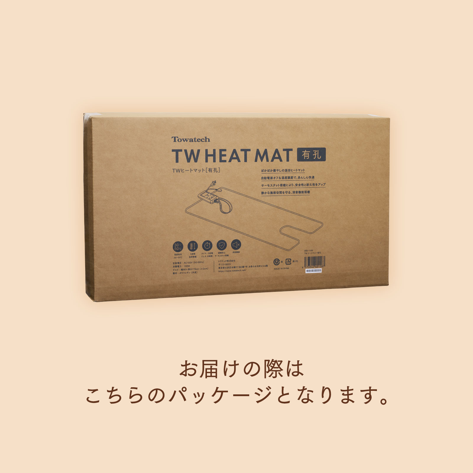 <商品仕様> 商品名 TWヒートマット(有孔) 定格電圧 AC100V(50/60Hz) 消費電力 180W サイズ 本体:長さ178×幅68cm(±2cm) 電源ケーブル:長さ1.88m コントローラー:長さ13×幅6.7×2cm 温度レベル 5段階(ヒートマット表面温度:約30~50℃) タイマー機能 3・6・8時間設定 材質 表面(外皮):ポリウレタン 重量 約2.4kg