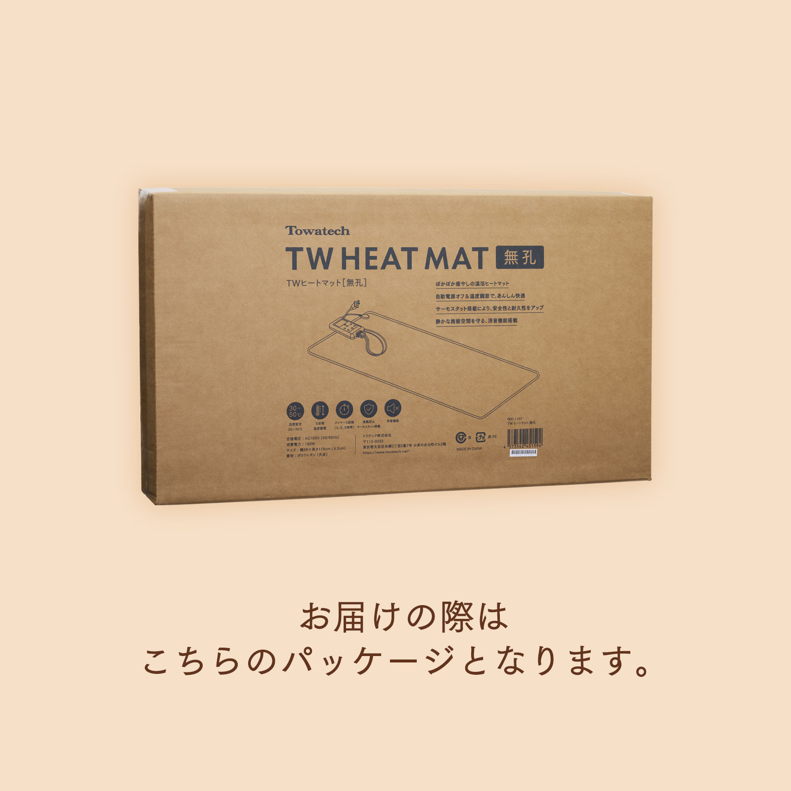 <使用上の注意> 本製品は防水仕様ではありません。水洗いはしないでください。 ヒートマットの上でキャスター付きの椅子は使用しないでください。破損の原因となります。 電気治療器などの高周波機器や無線機器の近くでは使用しないでください。誤作動や故障の原因となることがあります。 毛足のあるカーペットや絨毯の上で使用した場合、その上を歩くことでヒートマットがずれてしわが寄る可能性あります。しわが生じた場合は、ヒートマットを敷き直してください。 湿度の高い環境や、ヒートマットが湿気を含んでいる状態では、床(フローリングなど)に結露が発生する場合があります。結露している際は、よく拭き取ってください。 また、月に1回程度ヒートマットを持ち上げて床面の状態をご確認いただき、結露があった場合は風通しの良い場所で乾燥させてください。 ヒートマットの表面にマッサージオイルなどを付着させないようご注意ください。オイルが内部に浸透すると、加熱されたヒーター線に触れ、発煙・火災の原因になることがあります。 万一マッサージオイル等が付着した場合は、すぐに薄めた中性洗剤で拭き取ってください。 ご使用後は必ず電源をOFFにし、電源プラグをコンセントから抜いてください。 使用後は、マットの上にタオルやオイルなどを放置しないでください。熱がこもり、火災などの原因になるおそれがあります。 付属の取扱説明書は⇒こちら
