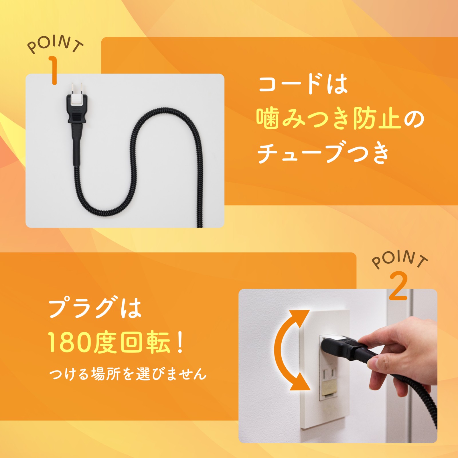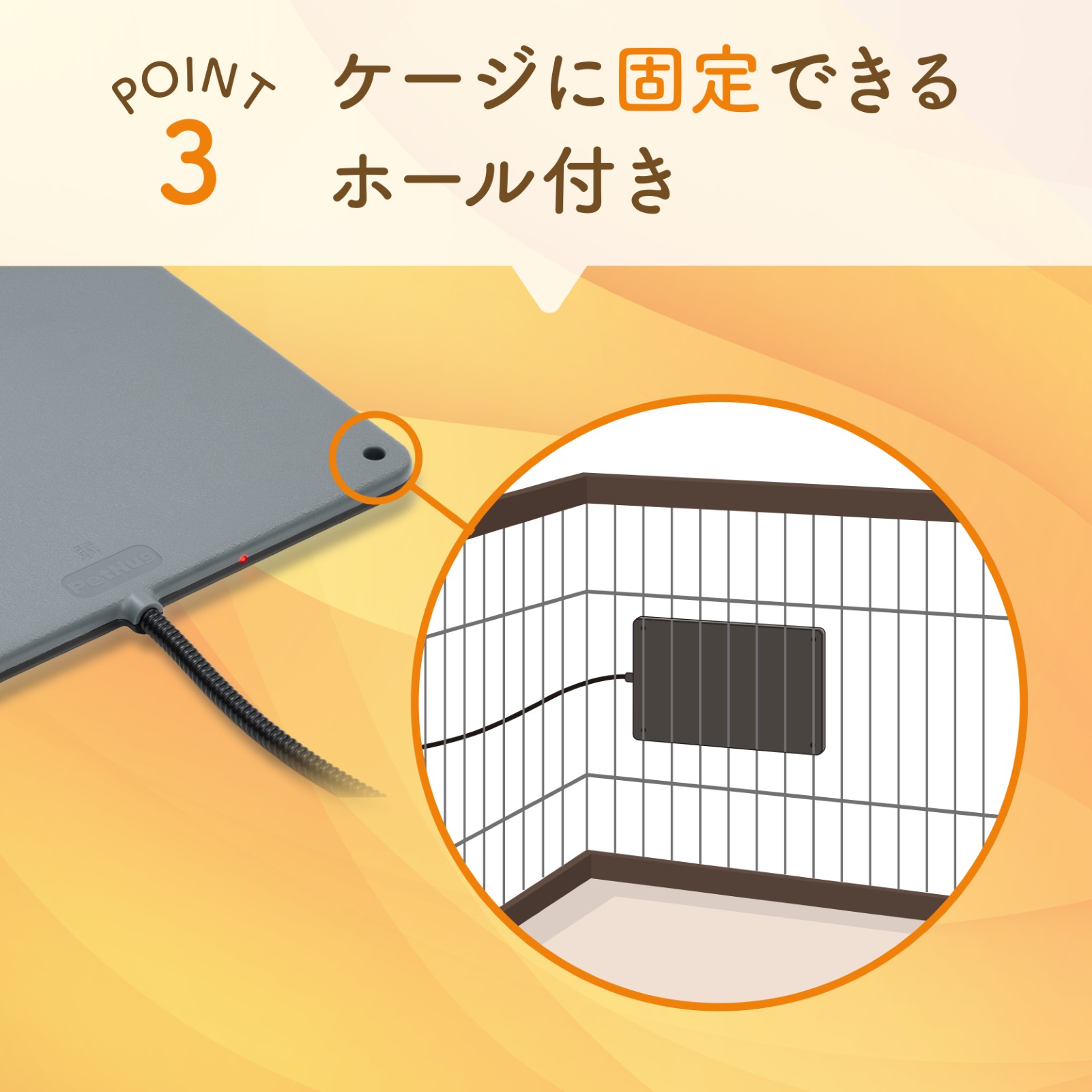 ケージ側面にも取り付けられる固定ホール付き。コードには噛みつき防止用のチューブがついています。