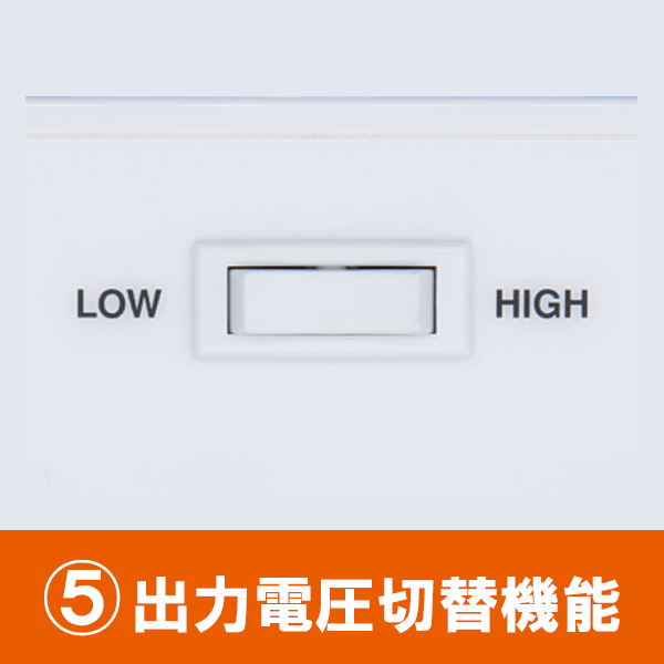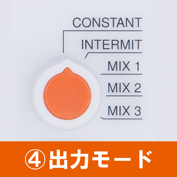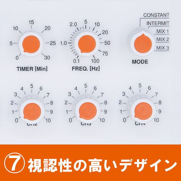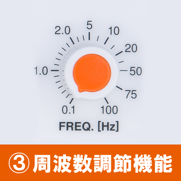 <機能一覧> ①Low バッテリー表示機能 電池残量が少なくなると、LED表示部に「LO」の表記が出力されます。 パフォーマンスが大きく落ちる前に電池の交換時期を知ることができるので、電池消耗による施術への影響を最小限に抑えることが出来ます。 ②タイマー機能 1~30分の間で、1分単位で設定が可能です。 ③周波数調節機能 出力周波数は、0.1~100Hzの間(全24パターン)で調節が可能です。 ④出力モード 連続波モード、間欠波モードに加え、疎密波モードを3パターン搭載しています。 ⑤出力電圧切替機能 出力電圧(波高値)は、LOW(最大24V)もしくはHIGH(最大48V)の2パターンで設定が可能です。 ⑥音量調節機能 動作音量は「OFF」「レベル1」「レベル2」の3段階で調節が可能です。 ⑦視認性の高いデザイン どの角度からも見やすいカラーとデザインです。 ⑧乾電池式 市販のアルカリ単2乾電池5本で稼働します。