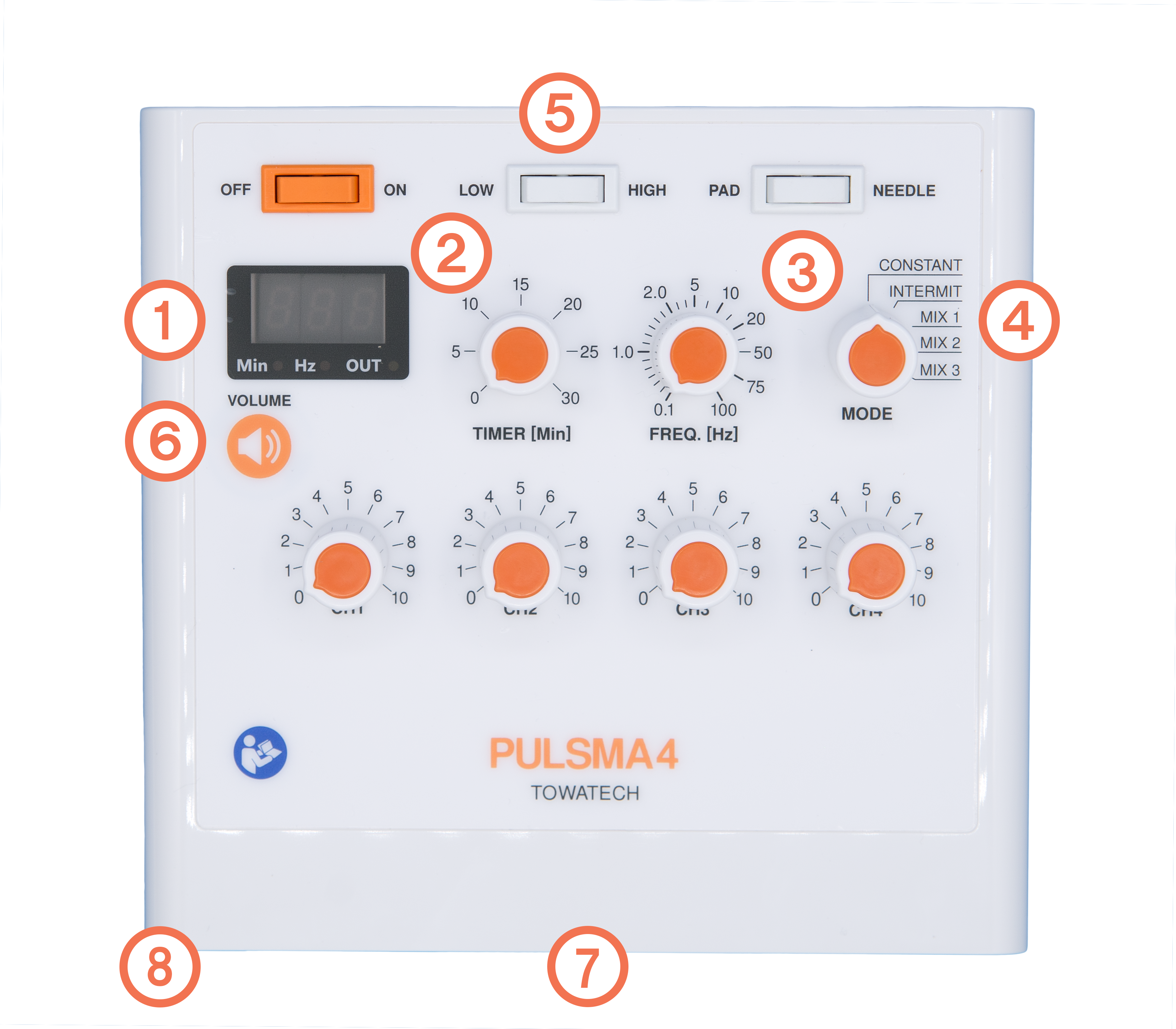 PULSMAを活用した施術動画を公開中! <商品説明> ・初めて手にする方にも、ご満足いただけるパルス治療器 発売以降、パルスマは多くの治療院にご愛用をいただき、現在ではパルスマを活用したセミナーが全国各地で開催されるに至っております。今回、パルスマ4の開発に当たり、パルスマ8の機能性とマイルドな通電性はパルスマ4にも踏襲されております。さらに可愛らしいデザインとコンパクトなサイズ感は、パルスマ8をご使用になられた方も、初めて手に取っていただく治療家様にも、ご満足いただける仕様です。 ・パルスマ8と同等の機能性を4回路に完全移植 パルスマ8の特徴といえば、5パターンの出力モード、24パターンの周波数調整機能、視認性に優れたデジタル表記など施術の質と幅を向上させる機能性が挙げられます。これらを4回路モデルに完全移植させることに成功しました。パルスマ4は、ミニマムサイズにパルス治療器の粋を集めた4回路モデルの決定版です! ・教育現場/エステサロン/往診/トレーナー現場で活躍間違いなし! パルスマ8の機能性はそのままに、よりコンパクトな筐体となって誕生したパルスマ4。これまで、4回路モデルの導入が一般的であった大学専門学校や美容鍼をメインメニューに据えたエステサロン、さらには近年、増加傾向にある往診(トレーナー)にもコミットするサイズ感が、パルスマ4の活躍の幅をさらに広めてくれます! <機能一覧> ①Low バッテリー表示機能 電池残量が少なくなると、LED表示部に「LO」の表記が出力されます。 パフォーマンスが大きく落ちる前に電池の交換時期を知ることができるので、電池消耗による施術への影響を最小限に抑えることが出来ます。 ②タイマー機能 1~30分の間で、1分単位で設定が可能です。 ③周波数調節機能 出力周波数は、0.1~100Hzの間(全24パターン)で調節が可能です。 ④出力モード 連続波モード、間欠波モードに加え、疎密波モードを3パターン搭載しています。 ⑤出力電圧切替機能 出力電圧(波高値)は、LOW(最大24V)もしくはHIGH(最大48V)の2パターンで設定が可能です。 ⑥音量調節機能 動作音量は「OFF」「レベル1」「レベル2」の3段階で調節が可能です。 ⑦視認性の高いデザイン どの角度からも見やすいカラーとデザインです。 ⑧乾電池式 市販のアルカリ単2乾電池5本で稼働します。 ・出力モード <ユーザーボイス> しんきゅう五行院院長 嶋村兼嗣先生 『現代を生きる鍼灸師のスタイルとニーズに応えてくれる初心者にも最適な“ファーストパルス”だと思います!』 パルスマ4の良さは、何と言ってもコンパクトな筐体にパルスマ8の充実の機能性が詰まっている点ではないでしょうか。 これまでパルスマ8をパルス治療のメイン機種として愛用してきましたが、私自身、治療院以外にセミナー会場や往診でパルス治療器を使用する機会が少なくありません。そんな時に、より軽量でバックにもストレスなく収まるパルスマ4は、治療スタイルを問わずに大活躍です! 通電時は、適切な電圧帯の柔らかな通電感覚が患者さんの負荷を和らげてくれます。音量設定も3段階で調整可能ですから、出張施術をはじめとした、様々なシチュエーションにもコミットしてくれるのではないでしょうか。電池の持ちも悪くないですし、ポップでかわいいデザインは美容施術にも最適だと思います。 パルスマ4は、現代を生きる鍼灸師の様々な働き方とニーズに広く応えてくれる治療器だと感じています。 ※個人の感想であり、商品の効果を確約するものではありません。 <商品仕様> 商品名 鍼電極低周波治療器 PULSMA4 サイズ W168×D162×H50~82mm(ダイヤルを除く) 重量 約700g(乾電池除く) 付属品 クリップコード:4本 単2形乾電池:5本 取扱説明書 保証書(取扱説明書内) 電源 乾電池(単2電池5本)※充電式乾電池使用不可 出力 4回路 周波数 連続波 0.1-100Hz / 間欠波 3-100Hz / MIX 10-100Hz タイマー 1~30分(1分単位で設定可能) 出力パターン 連続波、間欠波、疎密波(3パターンに設定可能) 出力音量 通常 / 小音 / 無音 終了音声 有(固定) <Q&A> 基本的な使い方を教えて下さい。 A.基本的な使い方は下記になります。 ①電源ボタンをONにします。 ②お好みのモードを設定した後、通電コードのクリップを電極に挟んで下さい。 ③出力ダイヤルをゆっくりと右に回し、患者さんの状態を見ながら強度を調整して下さい。 ④終了する際は全ての出力ダイヤル(8CH)を0の位置に戻します。 ⑤ピーッという終了音がなりましたら電源をOFFにします。 ※無音に設定している場合は終了音は鳴りません。 付属の取扱説明書は⇒こちら 鍼通電をしている最中にE1と表示され、出力が止まってしまうのはなぜですか? A.NEEDLEモードでは1回の施術に対して1C(クーロン)に達した際は通電制限が作動いたします。 通電量は表示部に「0.1、0.2・・・0.9」と累積表示されるような仕様となっております。 こちらの機能は鍼電極低周波治療器の認証基準で定められています。 付属の取扱説明書は⇒こちら <使用上の注意> 本商品は
