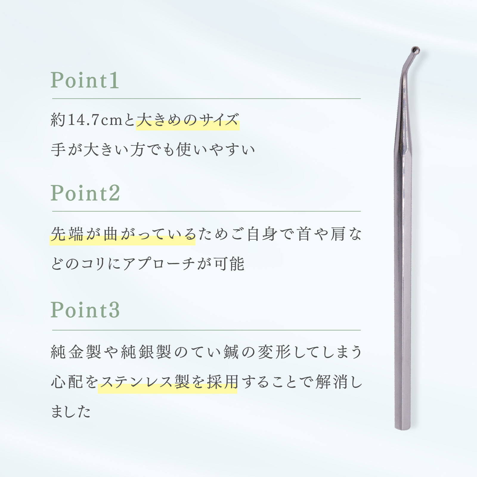 ポインター部が曲がっていることにより、通常のポインターと比較するとより圧をかけやすい仕様となっております。