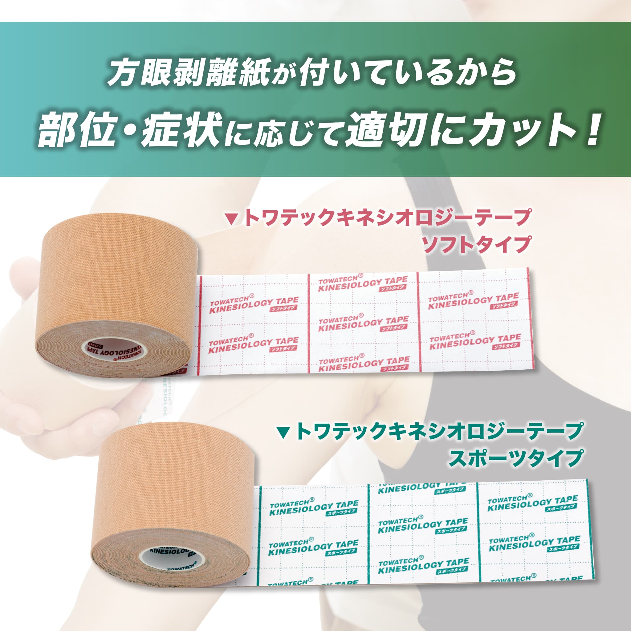 <Q&A> テープから独特のにおいがしますが使用して問題ないですか? A.商品開封後、稀に粘着剤のにおいがする場合がございます。 においが気になる場合は換気の良い場所で保管いただくと次第に落ち着いていきます。 品質上の問題はございません。 剥離紙は付いてますか? A.はい。剥離紙が付いております。 手で切れますか? A.手では切れません。ハサミをご使用ください。 ハサミの取扱商品一覧は⇒こちら 貼付するのに適した部位を教えて下さい。 A.特にここへ貼らないといけないという決まりはございません。 肩・腰・膝・足首に貼ることが多いですが、首・腕・手首・指先・太もも・ふくらはぎ・足の裏など 様々な部位へのテーピングにご使用いただけます。 症状に合わせたテーピング方法が動画で分かる!貼り方講座はこちら 貼り方の注意点はありますか? A.身体の痛みが明確な場合には痛む箇所にキネシオロジーテーピングを施します。テープを貼る際は筋を可能な限り伸ばしてください。貼り終えたらテープによる異常なつっぱり感がないか確認してください。つっぱり感がある場合は貼り直してください。 いつ剥がせばよいですか? A.日常生活では2~3日貼ったままでも大丈夫です。 テープを貼付したままの入浴も問題ありませんが入浴後はタオルで水分を取ってください。 運動後は汗の塩分が残るため剥がすことをお勧めします。 かぶれることはありますか? A.キネシオロジーテープは通気性を十分に考慮された製品ですが体質として皮膚がかぶれを起こしやすく心配な方は使用前に小さく切ったテープを貼ってかぶれないか確認してください。 キネシオロジーテープをもっと使いやすくするには? A.トワテックでは、様々なお悩みにお応えするアイテムを販売しております。 【テープを剥がした後、肌に糊が残る】 テープ粘着剤の残りを速やかに剥がす→二トリート リムーバースプレー / ピュアバリア 【肌がかぶれてしまう】 粘着製品のはくり刺激などから皮膚を保護する→ピュアバリア / キャビロン非アルコール性皮膜 保湿成分配合。皮膚を優しく保護し、上からテーピングも可能→リモイスコート 【テープを剥がす時に痛い】 粘着力を弱めて簡単に剥がす→3M キャビロン 皮膚用リムーバー 【マッサージ後にテーピングしたい】 ベタつかずすぐ乾くので使用後のテーピングが可能→メダリストアイピーゲル 【テープの粘着力をUPさせたい】 テープの粘着力強化用スプレー→二トリート タックスプレー