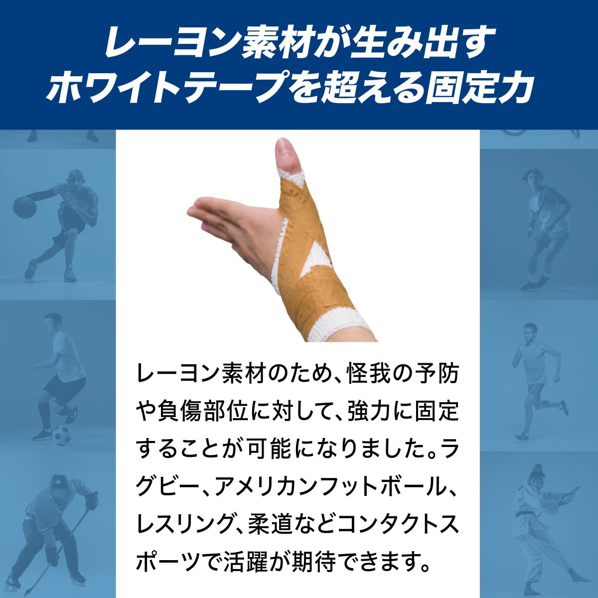 コンタクトスポーツなど激しい動きに対しても強力に固定し、関節をずれないように保ちます。
