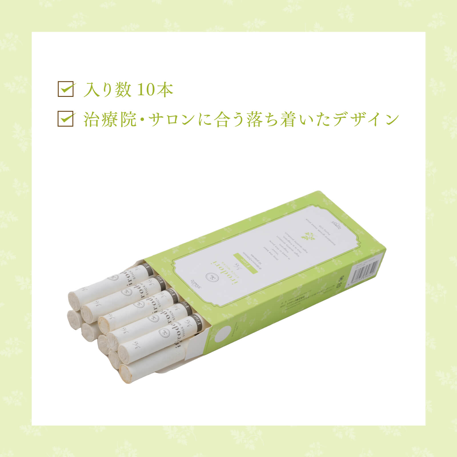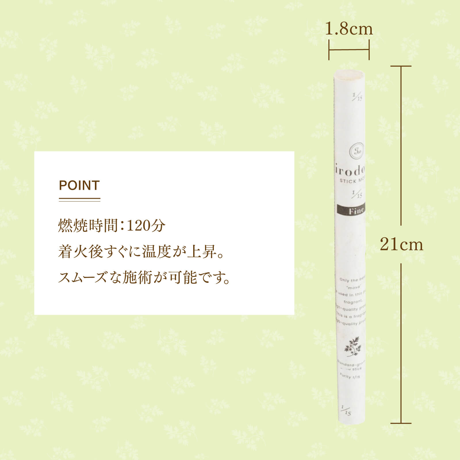 <商品仕様> 商品名 irodori 艾棒灸 1/15 Fine 10本 (旧名:MOEGI) サイズ 直径 約18×210mm 原材料 もぐさ 精製率 1/15 燃焼時間(1本が燃えきる時間) 約120分 生産国 中国 入り数 10本