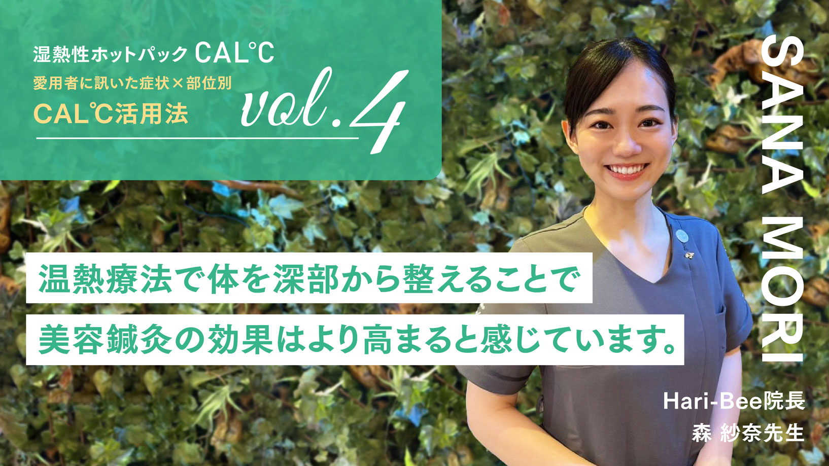 都内美容鍼灸サロンで鍼灸師として経験を積んできた森紗奈先生。今年晴れて独立開業し、美容鍼灸にさらに磨きをかけながらも「体を深部からじっくりとほぐすことで、ストレスや不調といった悩みにも寄り添える施術」をコンセプトに、美容鍼灸サロンをオープンした。施術効果をより高めるための温熱アイテムとして、CAL℃を取り入れていると話す森先生にその活用法を訊いた。 美容鍼灸の施術に温熱療法を取り入れている森先生。腹部へ刺鍼を行わない場合は、CAL℃ L-Lightを活用し、主に腰痛や臀部、下半身の冷えの症状に対して、広範囲をじっくり温めていく。女性にはLightの重さがちょうど良いと患者さんからも好評だ。 体をじっくりと温めることで、より効果的な美容鍼灸が期待できます。 体内の血液循環を適度に促進させることは、実は高級な美容液を使うこと以上に美容に効果的であると言われています。冷えて代謝が落ちている人は、お肌の生まれ変わり(ターンオーバー)が乱れがち。温熱で深部から温めることで基礎代謝が上がり、肌の修復力・再生力が高まるので、美容鍼の〝結果の出方〟が全然違ってきます。 特に温熱療法に関しては「寒い季節に行うもの」と想像されがちですが、そうとも限りません。夏場でもエアコンによる冷風や、発汗後に肌表面の温度が急激に下がることによって、体が冷えやすくなることがあります。そのため、年間を通して体を温めることは美容にとっても重要な要素だと考えています。 腹部への刺鍼を行う患者さんに対してはMサイズを使用。デコルテや胸元、胃の周辺に配置することで、呼吸の開き・リンパの流れを促し、むくみの緩和などにもアプローチ。一人ひとりの体質や体調に応じて温度設定が可能な点もCAL℃を気に入っている理由と話す。 当院ではCAL℃ L-LightとCAL℃Mサイズの2種類を施術内容に応じて使い分けています。 L-Lightは主に腹部への刺鍼を行わない方に使用しており、胸の下から膝あたりまで縦長に配置することで、体の前面全体を広範囲にわたって温めています。特に婦人科系のお悩みや身体の冷えが気になる方には、鍼を行う前に下腹部を温めておくこともあります。お腹全体を温められることで副交感神経が優位になり、ホルモンや睡眠の質にも良い影響が出ます。身体の鍼施術を行う際は、腰痛やお尻、下半身の冷えを確認し背中側から加温することもあります。通常のLサイズよりも軽量でありながら、ほどよい重みが感じられるのも特徴です。初めて鍼を受ける方や緊張感がある方にとっても、安心して落ち着けるアイテムです。 Mサイズは腹部への刺鍼を行う患者様を中心に使用しています。デコルテや胸元、胃の周辺などに配置することで、呼吸の開き・リンパの流れを促し、むくみの緩和などさまざまな目的に対応しています。熱を必要な部分にピンポイントで届けたい場合や、熱がこもりやすくのぼせやすい体質の方には、こちらのサイズを使用することが多いです。また、体温より少し高めの心地よい温かさに設定できるなど、細かな温度調整が可能なのも大きな魅力です。お一人おひとりに合わせた温度設定で、よりリラックスして施術を受けていただけるよう心掛けています。 ホログラフィックに彩られた完全プライベートスペースの院内は心身をリラックスへと導いてくれる。美容鍼灸に限らず、自律神経系や婦人科系まで様々な症状の患者さんが森先生の施術を受けに訪れる。 CAL℃は折り畳むことが出来るため、部分的に温めることが可能なのも嬉しいポイントです。体を温めた状態で刺鍼を行うことで、血色が良くなり肌の透明感が増すほか、目の開きが良好になります。刺鍼だけでは効果を感じにくい症状もありましたが、温熱療法を併用することで患者様に効果をよりご実感いただけるようになりました。施術の質をさらに高めるために、今では当院にとって欠かせない存在となっています。今後もCAL℃を活用しながら、心身ともにリラックスできる施術環境づくりを大切にしていきます。